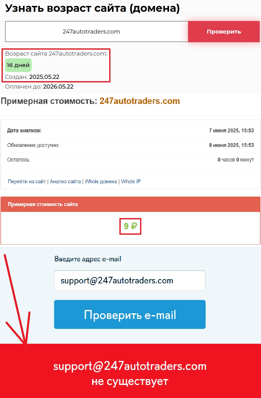 Интересно и то, как все это выглядит с технической стороны. По данным открытых сервисов, сайт обошелся его владельцам в символическую сумму — буквально 9 рублей. Вы понимаете, о чем это говорит? Даже начинающий блогер вложил бы больше в свой личный проект. Афера, кстати, существует с 22 мая 2025 года. Казалось бы, явно не внушительный срок.