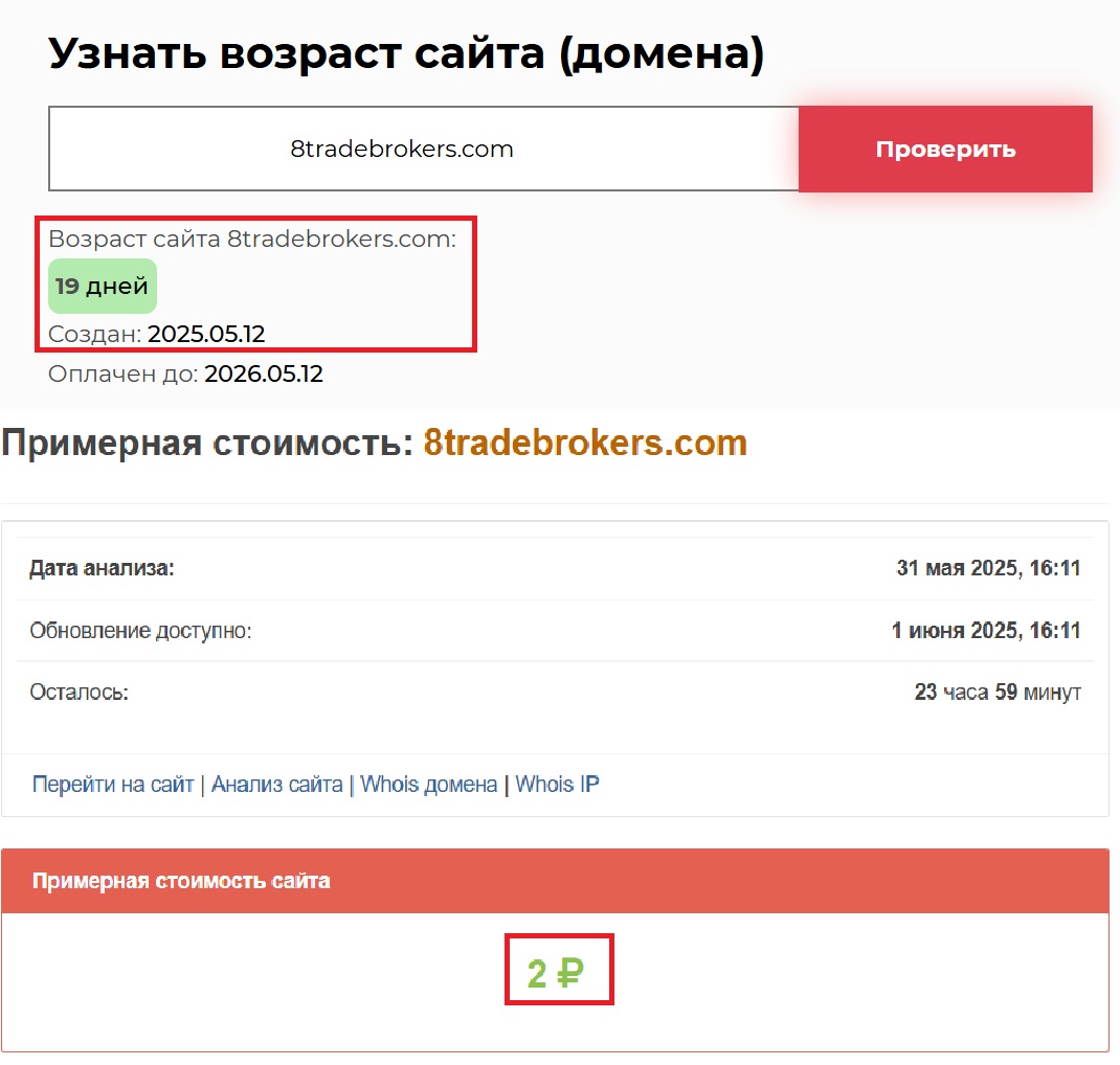 Мы задались целью проверить, что это за проект такой. Первое, что бросается в глаза — сайт 8tradebrokers.com. Примитивный до ужаса. Такое чувство, будто его делали на скорую руку. Страницы, как под копирку, абсолютно стандартный шаблон, который мы уже видели десятки раз. А теперь внимание: возраст сайта — чуть больше двух недель. 19 дней! А ведь они заявляют о долгом пути и якобы стабильной работе с клиентами по всему миру.