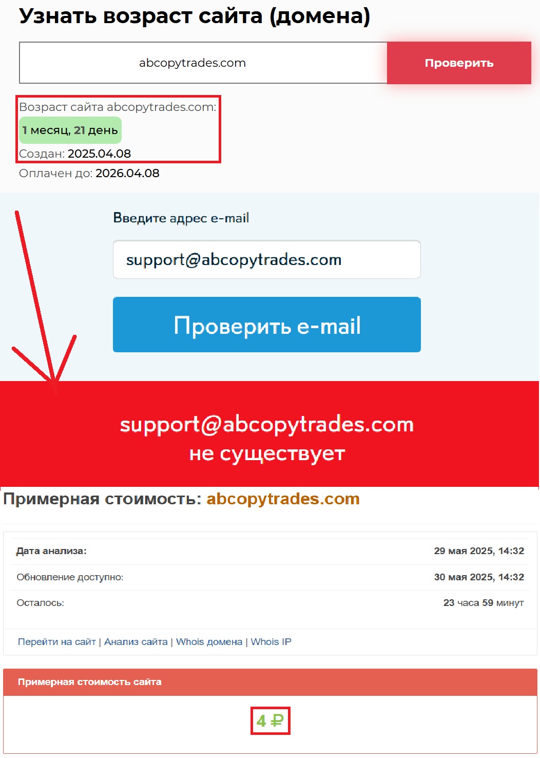 Связаться с представителями? Удачи. Телефон +1 (715) 850-9194 не отвечает, электронная почта support@abcopytrades.com полностью фальшивая, а указанный адрес в США при проверке оказался пустой строкой в реестре. То есть даже формальные реквизиты поддельные. Кто бы сомневался. Все это построено по старой схеме: заманить, вытянуть как можно больше средств и исчезнуть. Увы, метод до сих пор работает.