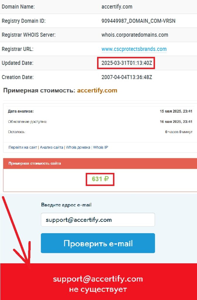 Но есть сервисы, которые показывают не только дату создания сайта, но и когда сменились его собственники (домен обновили). Благодаря проверке именно на таком портале нам удалось узнать об одном из подводных камней Accertify.