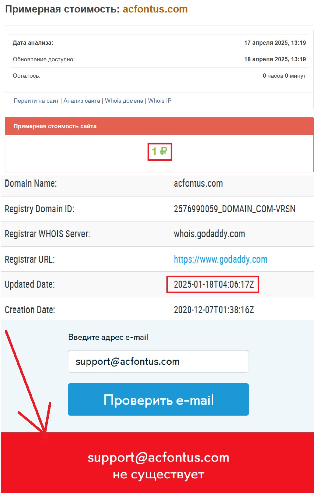 А что насчет стоимости ресурса? Ровно один рубль. Нет, мы не шутим. Ну вы сами подумайте: разве может уважающая себя финансовая компания работать на сайте, цена которого столь мизерная? Сомневаемся. Теперь немного о связи с этой конторой. Вернее, об ее отсутствии. Указанная почта support@acfontus.com — фейковая. Письма туда уходят, но обратно ничего не возвращается. Телефон вроде есть, но звонки — в пустоту. Ни поддержки, ни обратной связи, ни ответственности. Вас как бы приглашают сотрудничать, но если вдруг возникнут проблемы, решать вы их будете, как говорится, с самим собой. И это, увы, не преувеличение.