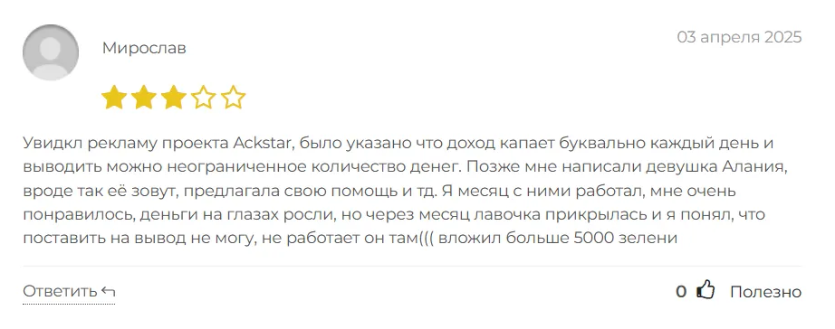 Отзывы об Ackstar указывают на несоответствие действительности предложенным обещаниям. Люди жалуются на отсутствие прозрачности, поддержки, проблемы с выводом средств и потери своих вложений.