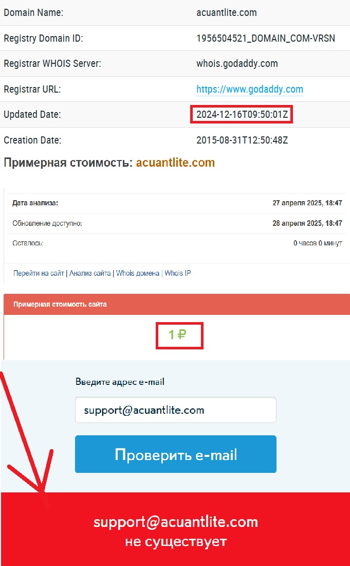 И это еще не все. Лицензий у Acuantlite нет и никогда не было. Регистрация — тоже темный лес. О какой безопасности инвестиций можно говорить, если площадка официально нигде не числится? Больше того, домен зарегистрирован 31 августа 2015 года, но настоящая активность началась лишь в декабре 2024. И, как по часам, почти сразу появились жалобы.
