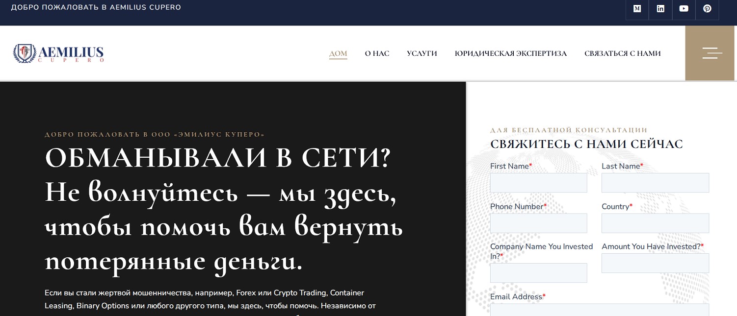По схожему принципу работают автора Aemilius Cupero. Это очередной фейковый проект, который его создатели пытаются выдать за надежную и серьезную юридическую фирму. Но такой контора может показаться лишь на первый взгляд. Ее более детальный анализ позволяет выявить немало подводных камней, свидетельствующих о недобросовестном характере ресурса.