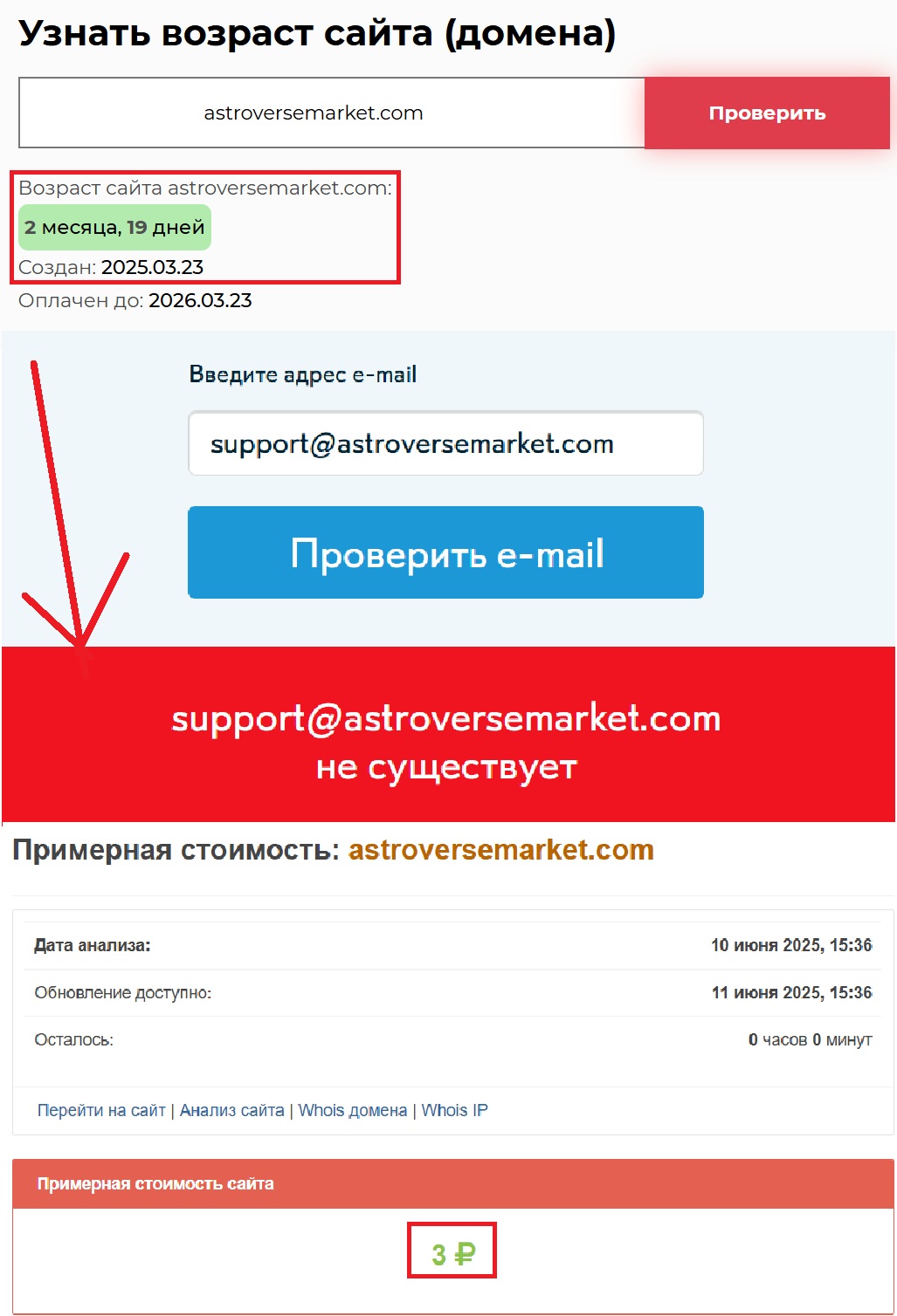 Интересный момент касается возрастa сайта. Мы использовали сервис Whois — вы тоже можете проверить. Дата регистрации — 23 мая 2025 года. То есть проект крайне молодой. А теперь подумайте: возможно ли за столь короткий срок выстроить устойчивую финансовую структуру с профессиональной командой и реальными клиентами? Вопрос, конечно, риторический. Еще одна деталь, которая нас откровенно поразила. Стоимость самого сайта — мизерная. Три рубля! Понимаете, да? Разговор о серьезных вложениях тут не просто неуместен — он абсурден. Очевидно, что те, кто запускал этот ресурс, вовсе не собирались строить реальный бизнес.