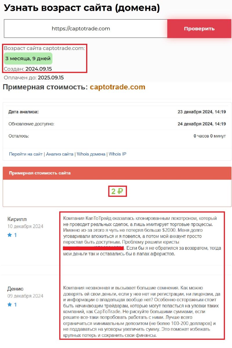 Итак, афера расположилась по адресу captotrade.com. Проверка сторонними сервисами показала, что веб-ресурс начал свою деятельность всего лишь 3 месяца и 9 дней назад, то есть 15 сентября 2024 года. Это крайне маленький промежуток работы для легальной компании. Если посмотреть на легальных брокеров, то можно найти проекты которые много лет зарабатывали себе репутацию.