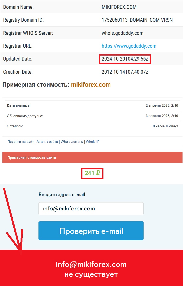Проверка через сторонние сервисы показывает реальную картину. Вся эта «многолетняя репутация» — выдумка. На самом деле проект был запущен 20 октября 2024 года, а значит, ему чуть больше пяти месяцев. Такой срок — ничто для серьезного брокера. Но и это еще не все. Оказывается, сам сайт стоит 241 рубль! Это значит, что аферисты не собираются здесь надолго задерживаться. Они быстро соберут деньги и исчезнут, оставив своих клиентов ни с чем. Контактная информация представляет собой почту info@mikiforex.com, но даже она оказалась фейковой.