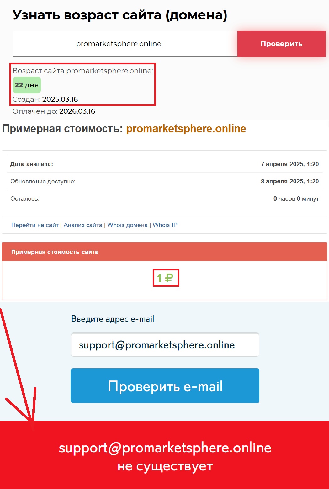 Обратите внимание и на срок существования сайта. Согласно данным сервисов анализа доменов, платформа была зарегистрирована совсем недавно — буквально 22 дня назад. Тем не менее, они уже заявляют о многолетнем опыте, «сотнях довольных клиентов» и стабильной прибыли. Возникает логичный вопрос: откуда такие громкие слова, если нет ни времени, ни доказательств в их пользу? Все это — красивая обертка, внутри которой пусто. Кстати, стоимость героя данного обзора не превышает и одного рубля.