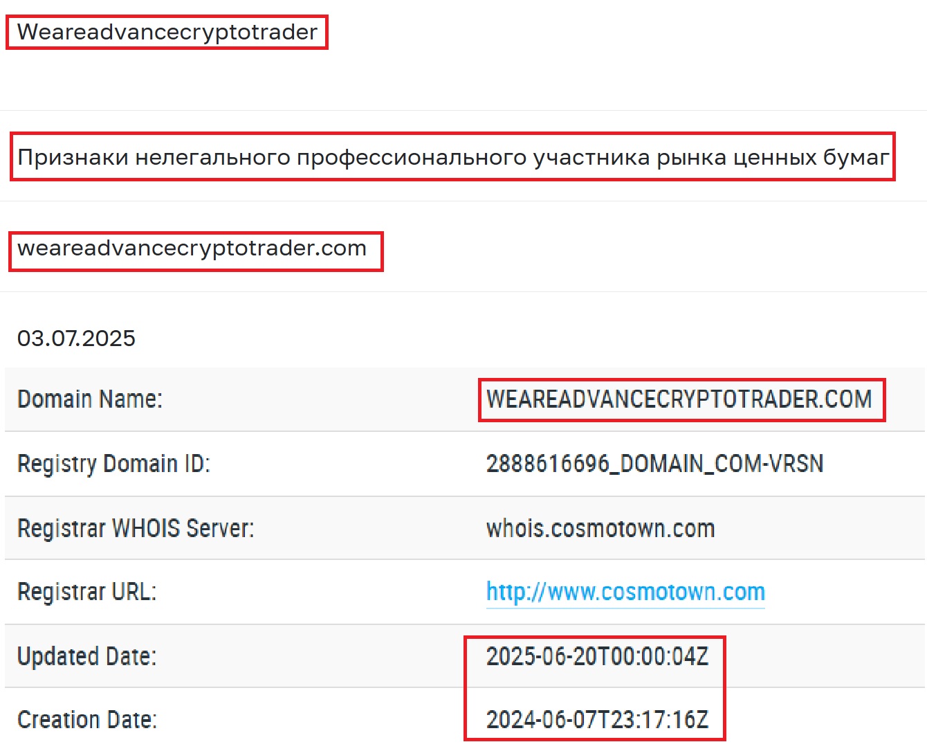 Один из первых сигналов — возраст сайта. Заглянем в Whois (https://who.is/whois/weareadvancecryptotrader.com): домен зарегистрирован 7 июня 2024 года, но его реальная деятельность началась с момента обновления 20 июня 2025 года. Проекту всего лишь меньше месяца. А вам, между прочим, будут рассказывать про “годы успешной работы”. Проверяем Веб-Архив (https://web.archive.org/web/20240501000000*/https://www.weareadvancecryptotrader.com/), где хранятся копии того или иного веб-ресурса — и что же? Сайт действительно существует с июня 2024 года.