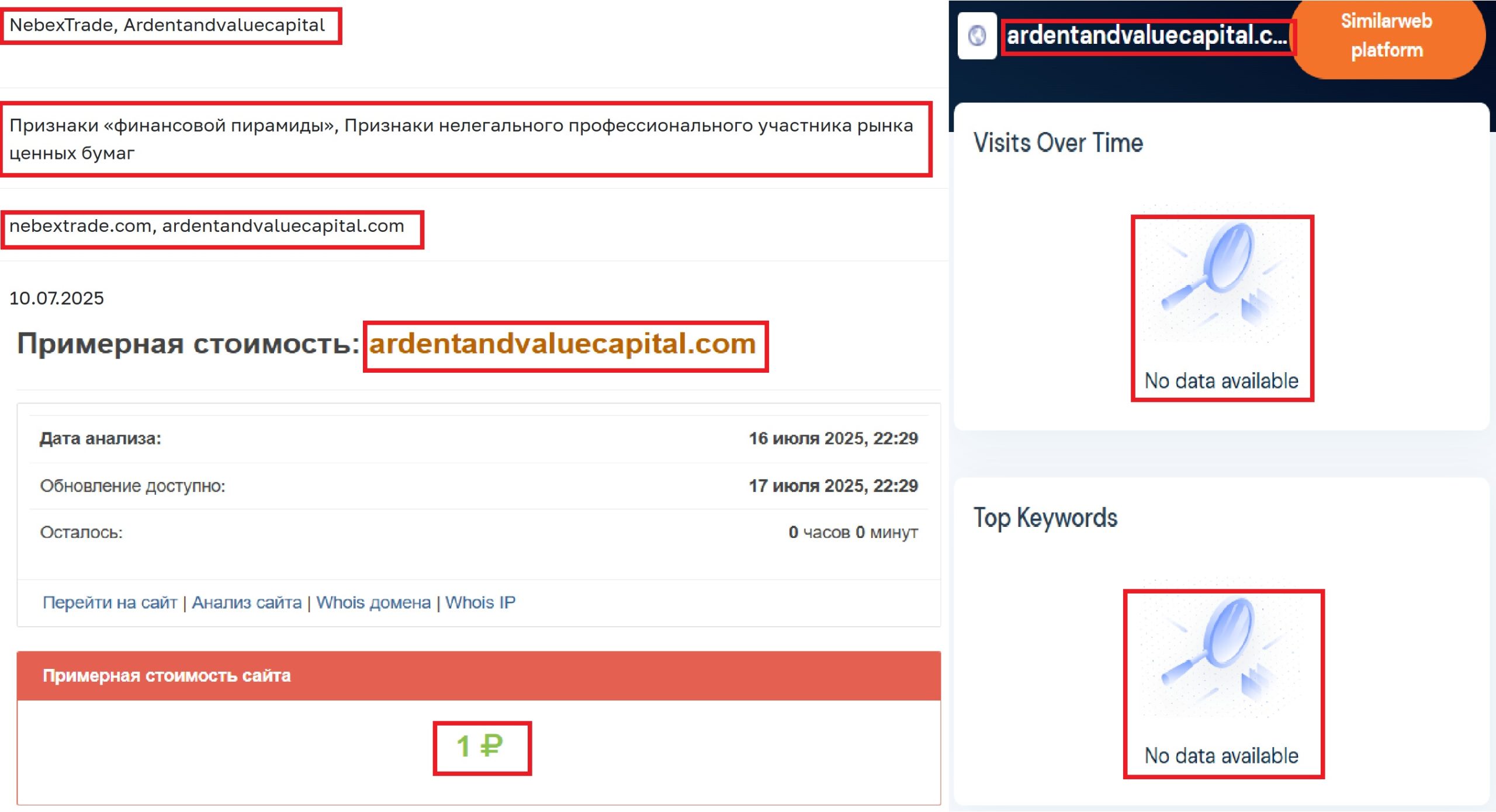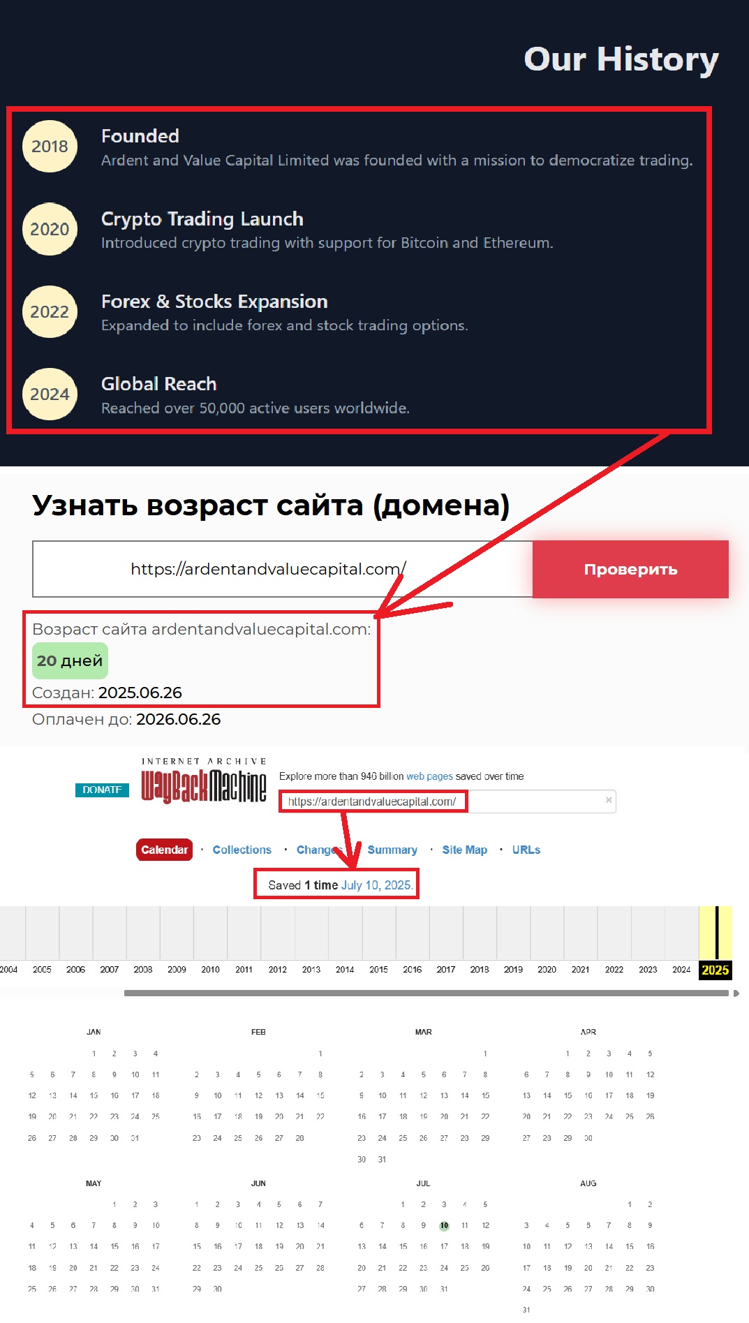 Проверка через Whois (https://who.is/whois/ardentandvaluecapital.com) показывает, что домен зарегистрирован только в июне 2025 года. При этом на сайте утверждается, что брокер работает с 2018 года — несостыковочка. Посмотрим на наличие копии сайта на странице Веб-Архива (https://web.archive.org/web/20250000000000*/https://ardentandvaluecapital.com/) — и тут тишина. Точнее, единственная сохраненная копия была создана 10 июля 2025 года, то есть ни о каком многолетнем опыте и речи быть не может. То есть раньше сайт попросту не существовал, а история компании — выдумка.