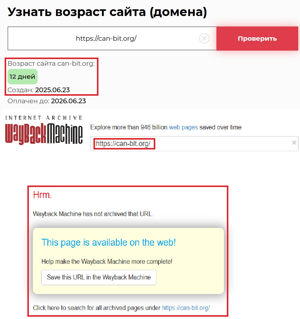 Также сайт can-bit.org был проверен через Веб-Архив (https://web.archive.org/web/2/https://can-bit.org/) — крупнейший интернет-архив, где сохраняются копии сайтов прошлых лет. Данные о can-bit.org там отсутствуют, что подтверждает его недавнее появление и отсутствие какой-либо истории до этого момента. Надежные компании обычно имеют цифровой след: архивные версии страниц, фиксированную историю развития, подтверждающую их долгосрочную работу.