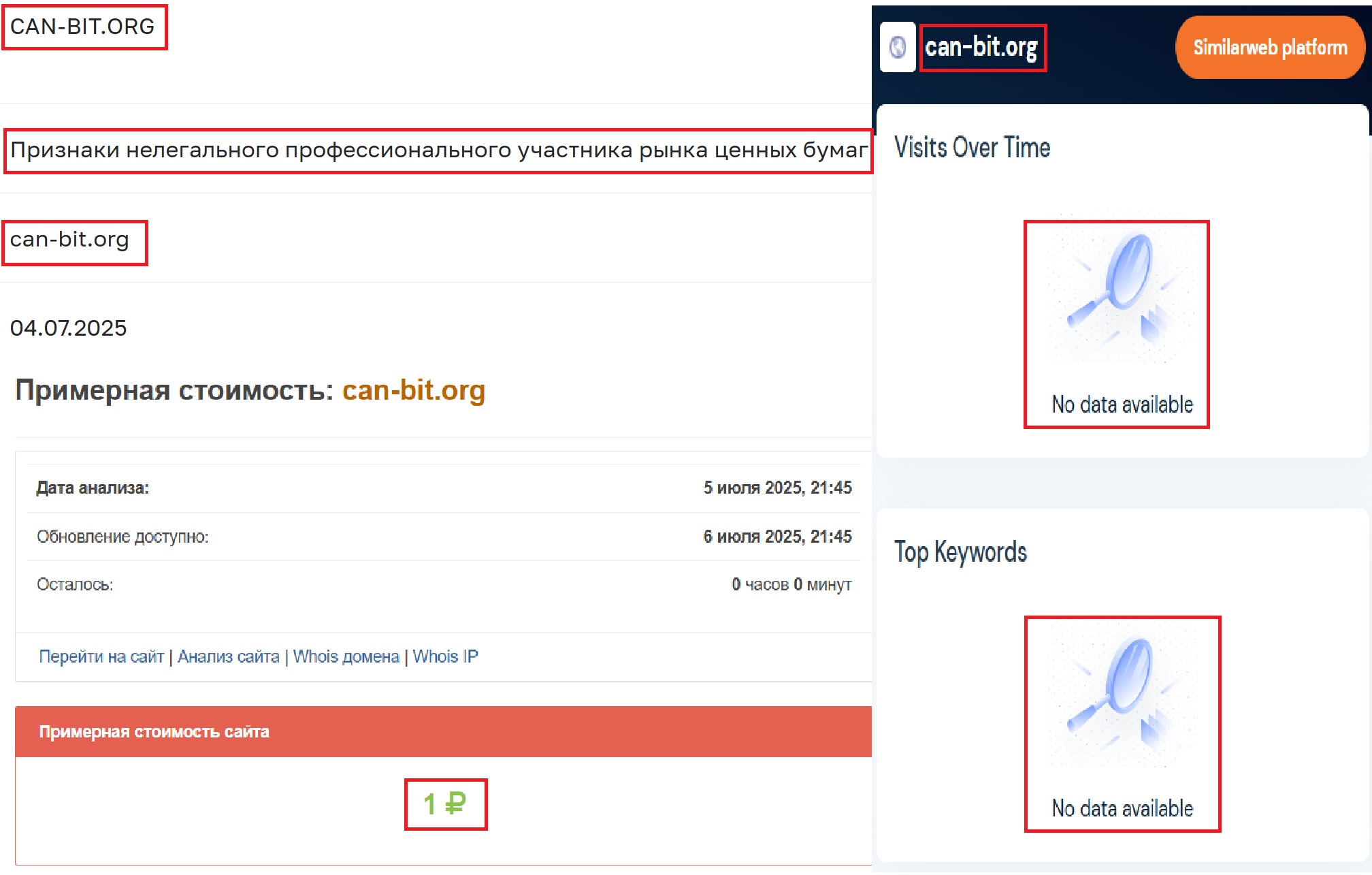 Начнем с того что мы проверили цену домена can-bit.org на сайте Seolik и она составляет всего 1 рубль. Это очень низкий показатель. Если бы проект реально приносил доход и работал законно, его стоимость была бы намного больше. Далее мы провели анализ трафика через сервис Similarweb, который показал что сведения о посещаемости отсутствуют, невзирая на громкие заявления о «популярности» и «открытости».