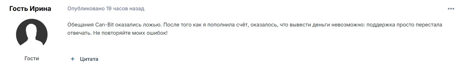 “Can-Bit это чистой воды афера! Сначала все было красиво: приятный менеджер, «аналитики», уверенные речи, отчеты…я вложила сначала 150 долларов, а потом еще, и уже не смогла остановиться, через время продала машину, чтобы «увеличить доходность». А в итоге тишина. Ни аккаунта, ни поддержки, ни денег!”