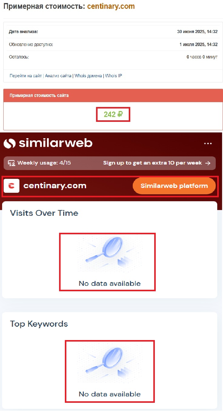 Цена сайта — 242 рубля. В то же время, нормальные брокеры инвестируют тысячи, если не десятки тысяч в свой веб-ресурс, уровень услуг очень низкий. Что нам сказано о регистрации или лицензии? Везде только слова о легальности, а никаких доказательств не предоставляется. Проверка при помощи SimilarWeb — сервиса, который демонстрирует посещаемость сайта — демонстрирует нам, что Centinary посещает крайне мало людей, лжеброкер не популярен.