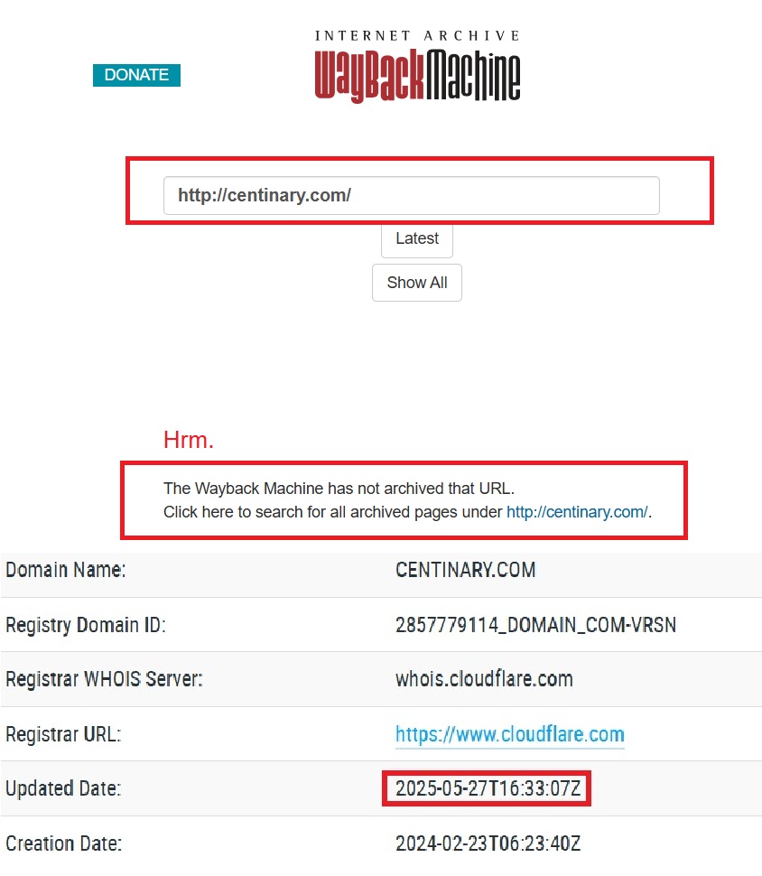 Проще говоря аферисты начали деятельность по адресу centinary.com 27 мая 2025 года. Они делают это с единственной целью — повысить уровень доверия, ведь так они создают иллюзию многолетнего опыта работы. Если вы хотите проверить возраст того или иного проекта, то мы рекомендуем вам использовать Веб-Архив (https://web.archive.org/web/20250000000000*/https://centinary.com/). Это архив сайтов, он демонстрирует нам историю любой страницы. Этот же веб-ресурс не был просканирован ни разу, значит он появился недавно.