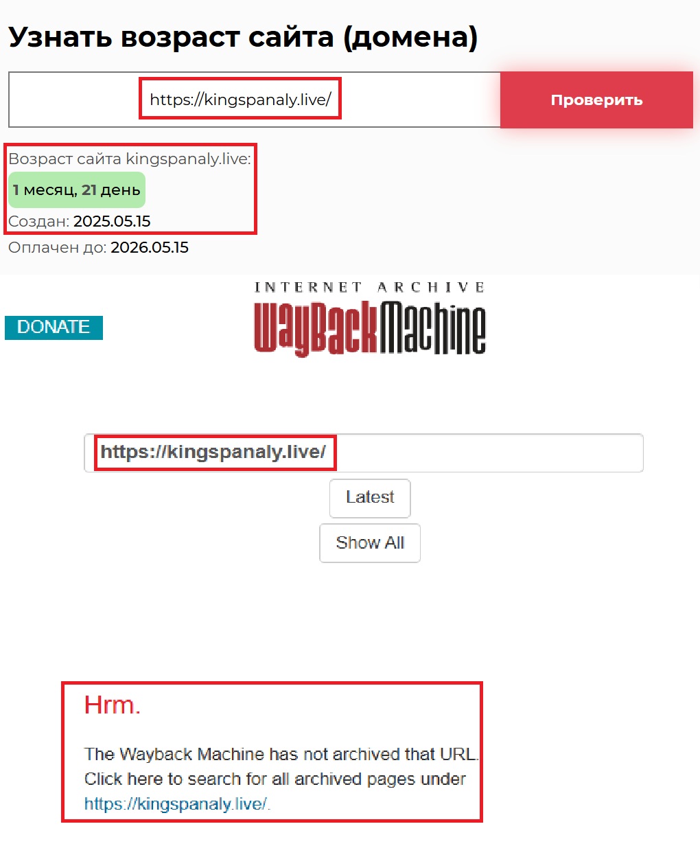 С чего начинается проверка? Конечно, с даты регистрации сайта. Смотрим Веб-Архив (https://web.archive.org/web/20250707062701/https://kingspanaly.live/) — и сразу ловим вранье, в архиве нет ни одного упоминания об этой компании. Также в футере можно найти упоминание, что герой данного обзора работает с 2023 года, но проверка возраста Whois (https://who.is/whois/kingspanaly.live) демонстрирует нам, что сайт сделан 1 месяц и 21 день назад. Где они были до этого? В подполье? Нет, просто врут об опыте, чтобы выглядеть солиднее. Типичная схема.