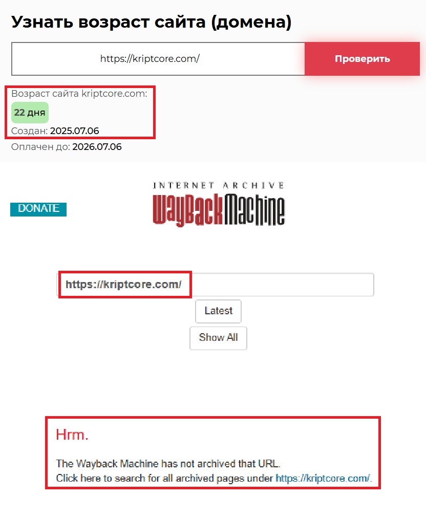 Компания утверждает, что работает уже много лет, но достаточно заглянуть в Веб-Архив (https://web.archive.org/web/20250710011507/https://kriptcore.com/) — архив, где хранится внешний вид сайтов в разные периоды — чтобы понять: раньше этой “организации” просто не существовало. Регистр домена по данным Whois (сервис для отслеживания технических данных сайтов) показывает: ресурс создан 6 июля 2025 года. То есть легенда о “многолетнем опыте” не выдерживает никакой критики.