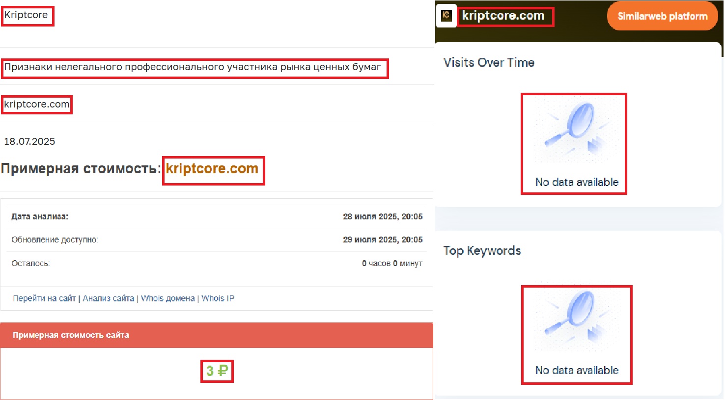 Если пробить сайт через Seolik (платформа оценки стоимости и оптимизации сайтов), выходит, что домен стоит какие-то копейки — около 3 рублей. А SimilarWeb, анализирующий трафик веб-ресурсов, сообщает — посещаемость у kriptcore.com почти нулевая. Это крайне подозрительно для “успешной компании”.