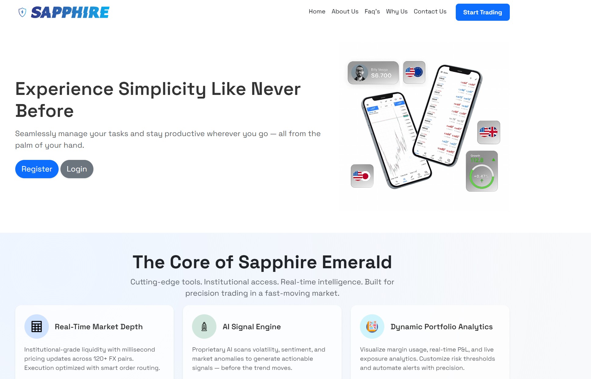 Очередной “инвестиционный стартап” с многообещающим названием — Sapphire Emerald (sapphireemerald.com) На главной странице нас встречает слоган: «Испытайте простоту, как никогда раньше…» Создатели проекта обещают инновационный подход, надежные решения и долгосрочное партнерство. Все оформлено с иллюзией легальности и элитности — синие градиенты, «бизнес»-иконки и доверительный тон.