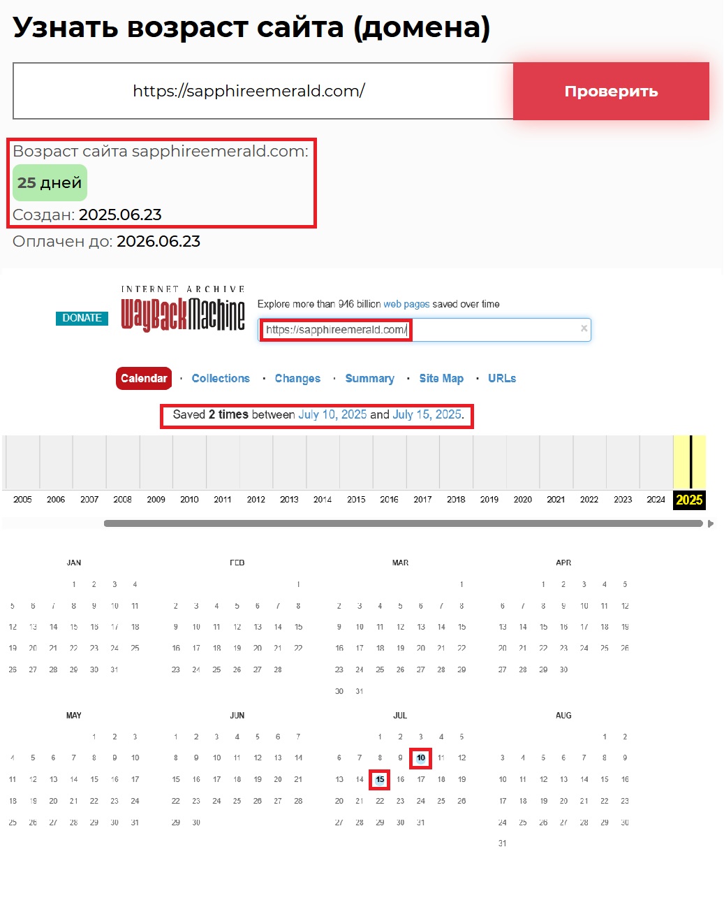 Мы проверили сайт через Веб-Архив (https://web.archive.org/web/20250000000000*/sapphireemerald.com) — первая фиксация ресурса датирована 10 июля 2025 года. То есть на момент написания текста проекту менее месяца.