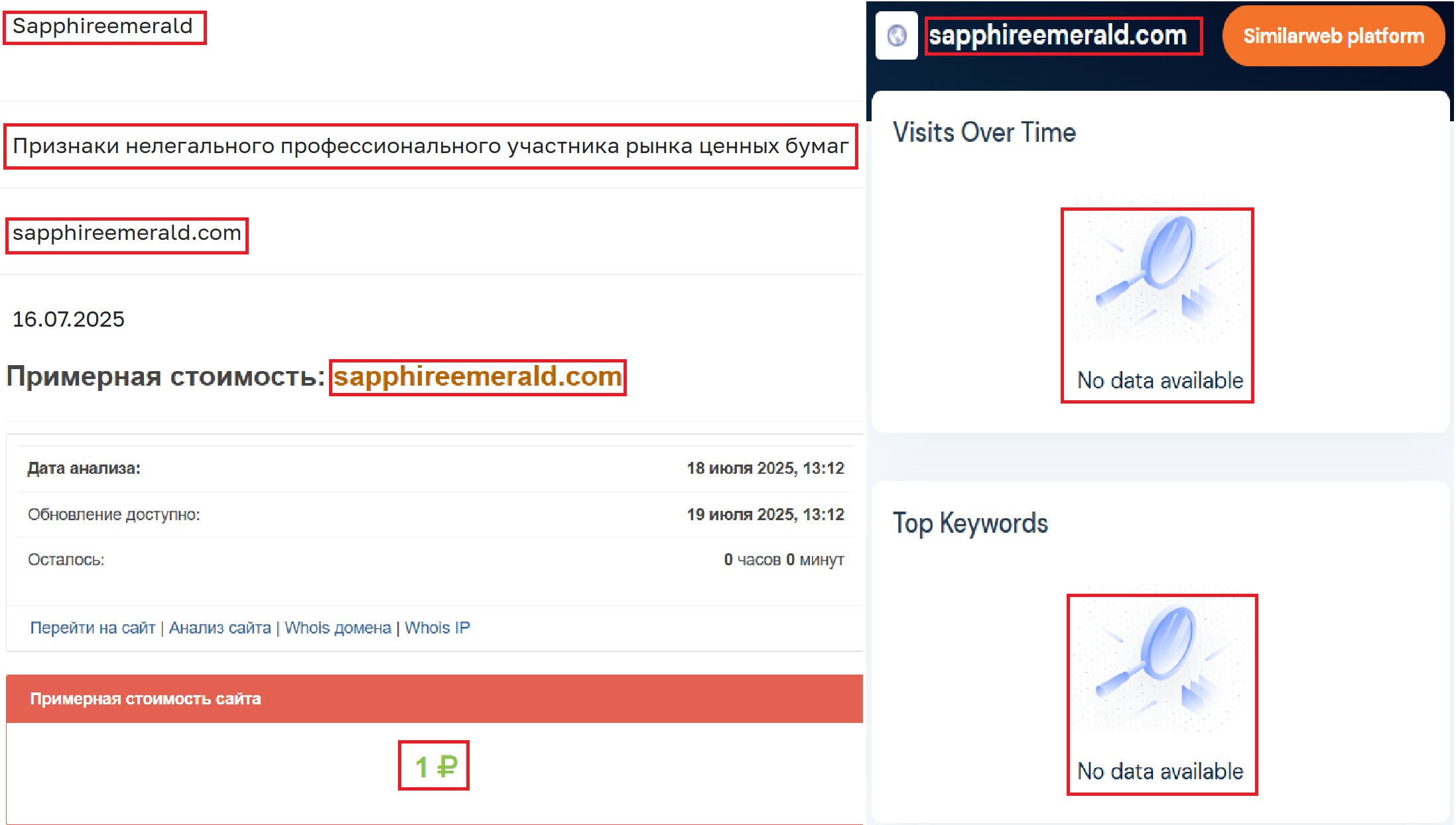 Whois (https://who.is/whois/sapphireemerald.com) подтверждает что домен зарегистрирован 23 июня 2025 года. Да и популярностью среди инвесторов тут и не пахнет — контора имеет нулевую посещаемость, что подтверждается сервисом для проверки трафика SimilarWeb.