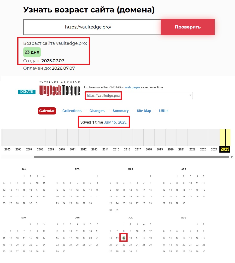 Начнем с простого: проверка через Whois (https://who.is/whois/vaultedge.pro) показывает, что домен зарегистрирован совсем недавно — 7 июля 2025 года. То есть сайту нет и месяца. Это никак не вяжется с рассказами о “профессионализме” и «тысячах клиентов». Заглянем в Wayback Machine (https://web.archive.org/web/20250000000000*/https://vaultedge.pro/) — одно сохранение и то 15 июля 2025 года. Это значит, что ресурс был создан с нуля и никакой истории за ним не стоит.