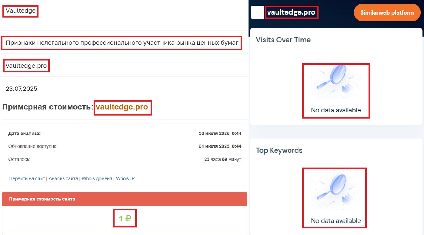 По данным сервиса Seolik (оценка стоимости и параметров сайтов), этот сайт оценивается в символическую сумму — всего 1 рубль. Для сравнения: действующие финансовые организации вкладывают десятки тысяч рублей в разработку и поддержку своих ресурсов. А вот SimilarWeb, который показывает посещаемость и активность на сайте, не фиксирует вообще никаких данных. То есть трафика нет. Никто туда не заходит, кроме случайных жертв.