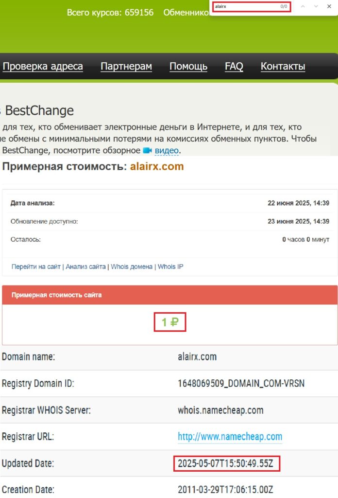 И это при том, что сам проект работает от силы несколько дней. Проверка домена показала, что он был зарегистрирован в далеком 2011 году, однако активничать на нем начали лишь 7 мая 2025. Получается, что ни о какой опытности обменного пункта и речи быть не может.