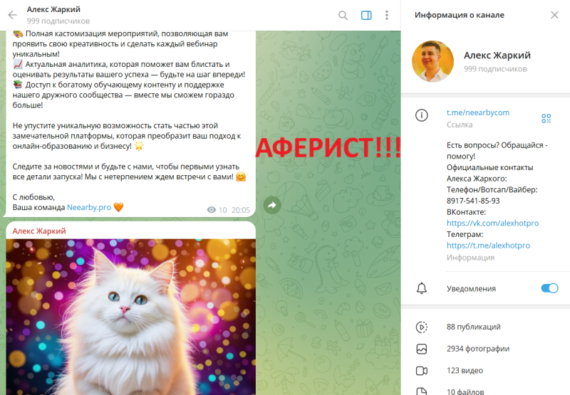 Алекс Жаркий называет себя успешным предпринимателем и является автором сайта neearby.com. В Телеграм функционирует его канал, в котором жулик активно рекламирует свой проект и призывает пользователей к сотрудничеству.
