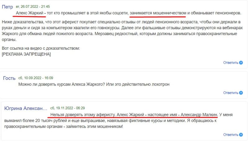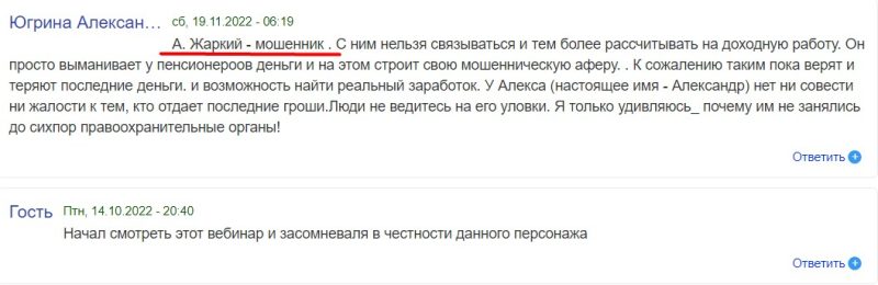 Что касается реальных отзывов, то их можно найти только на независимых сервисах. Там встречается немало жалоб и негативных сообщений в адрес Жаркого. Люди рассказывают как лишились немалых вложений по вине этого мошенника и рекомендуют с ним не связываться.