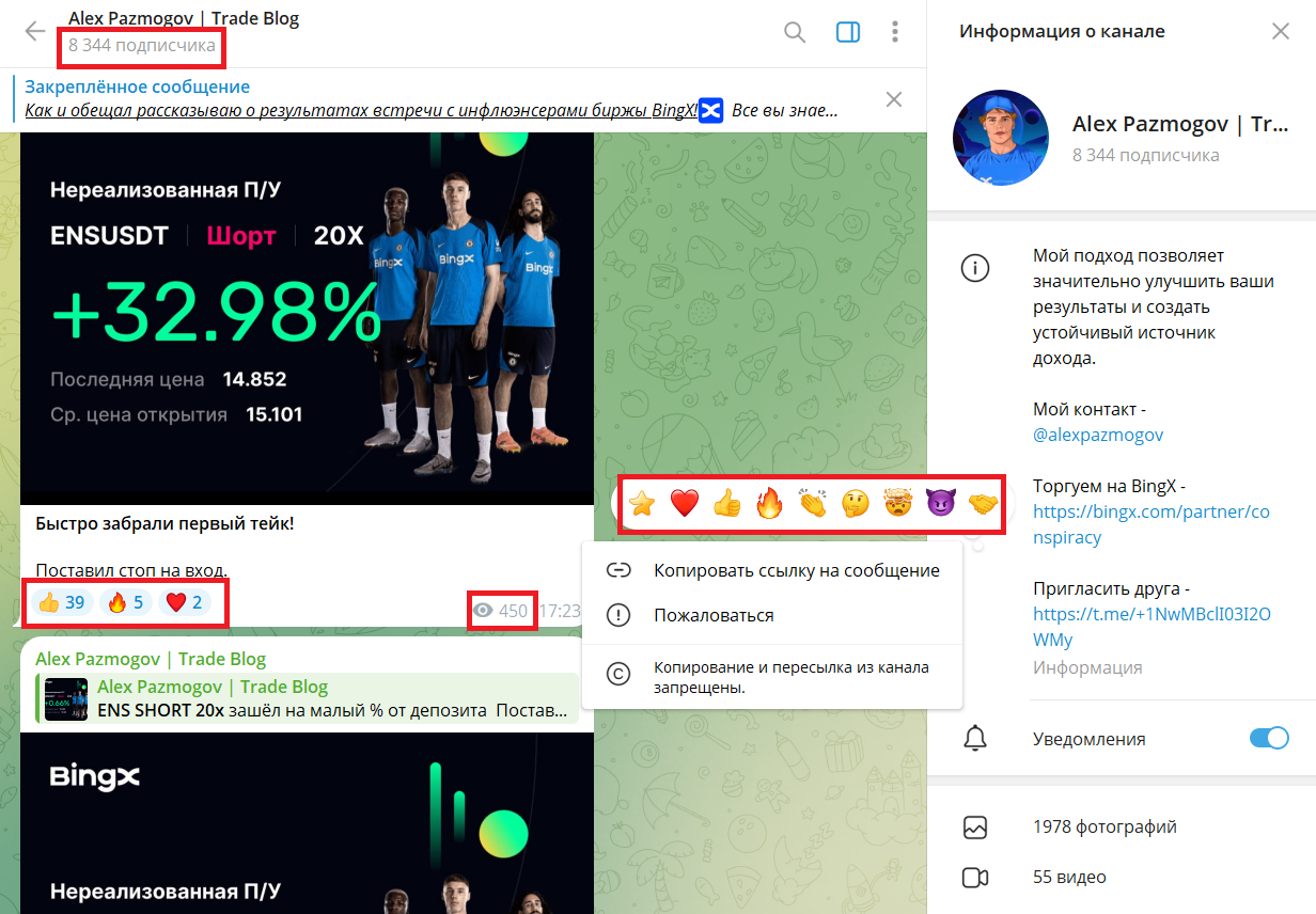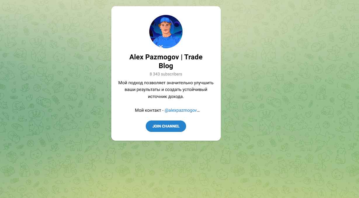Аферист, управляющий каналом Alex Pazmogov | Trade Blog пишет, что может помочь организовать трейдинг так, дабы он стал источником крупной и стабильной прибыли. В ленте пространства упоминается, что админ хорошо зарабатывает на криптовалютной бирже, получает доход от работы с фьючерсами. Также среди постов встречаются рекомендации по торговле, комментарии автора о заключаемых на бирже сделках. Основной акцент в сообществе делается на индивидуальном взаимодействии: мошенник предлагает фолловерам совместную торговлю, которая, согласно легенде, должна приносить сказочный заработок.