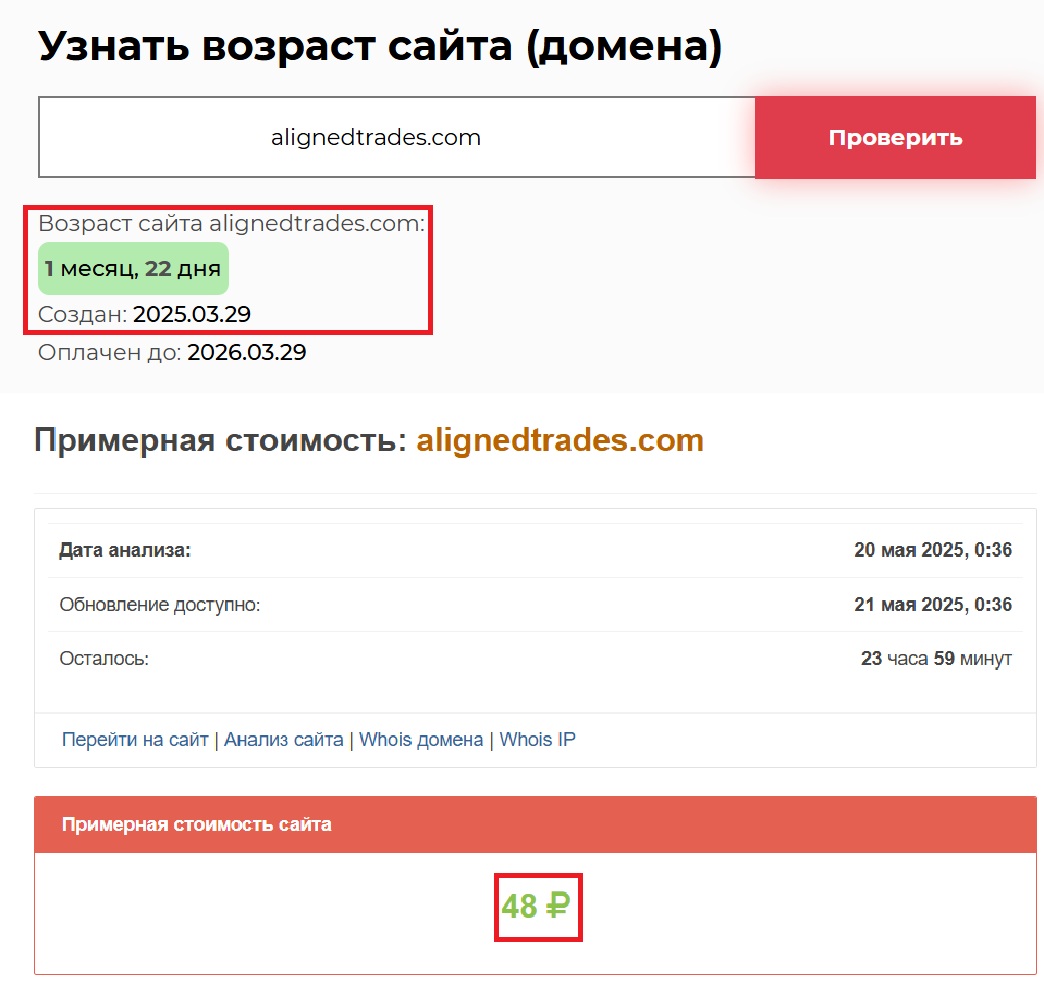 Что мы выяснили, когда попытались заглянуть глубже? Домен был зарегистрирован только 23 марта 2025 года. Это слишком маленький срок для реальной компании. Классическая схема обмана: сделай так, чтобы выглядело серьезно — и все, клиенты сами потянутся. А потянутся ли? Возможно. Потому что они видят не реальную компанию, а видимость стабильности. Но если посмотреть на стоимость сайта — становится грустно. Всего 48 рублей. Именно столько сейчас оценивается этот «бизнес». Вы правда считаете, что компания с такой ценностью будет работать честно и прозрачно? Сомневаемся. И мы уверены — вы тоже.