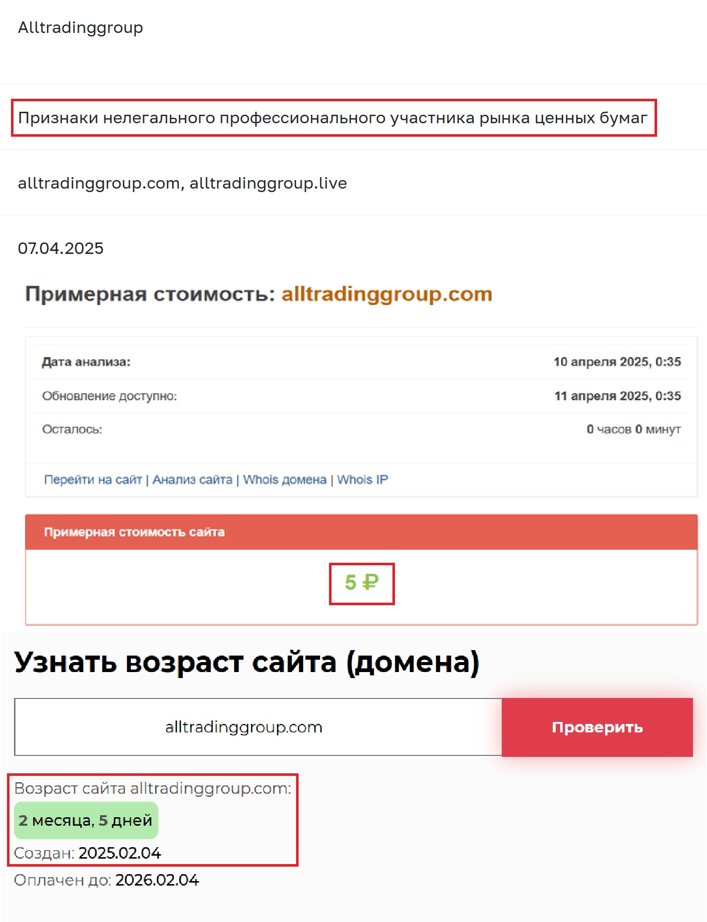 Хотите узнать, как долго вообще существует эта «великая инвестиционная компания»? Мы проверили через Whois. Всего 2 месяца и пять дней. То есть буквально год назад этого домена еще не было — а уже сейчас он обещает вам «опытную команду» и «лет пятнадцать успешной работы». Серьезно? Они даже не удосужились написать что-то более-менее правдоподобное. И стоимость сайта, к слову, пять рублей. Даже не сотня, чтобы создать хотя бы намек на ценность. Сложно представить себе настоящего брокера с таким «капиталом». Да и зачем им, если задача другая — собрать депозиты и испариться. Быстро, бесследно, по схеме, которую они, похоже, используют не в первый раз.