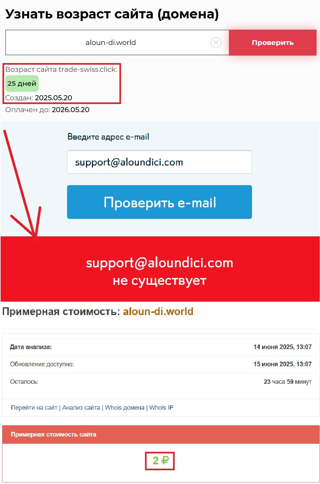 А теперь — внимание. Утверждается, что компания якобы существует уже давно. Но стоит заглянуть в данные о домене, и все становится ясно. Настоящая активность начинается 20 мая 2025 года. Что еще настораживает — полное отсутствие прозрачности. Нет ни регистрации, ни лицензии, ни нормального способа связи. Единственный канал общения — фальшивая почта support@aloundici.com.
