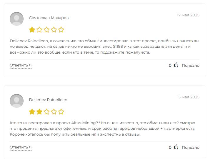 Если говорить об отзывах, то в сети можно найти немало негативных комментариев, в которых люди жалуются на проблемы с выводом средств, отсутствие поддержки и непрозрачную деятельность компании. Также в своих сообщениях бывшие клиенты указывают на использование аферистами стандартной схемы развода. Большинство пользователей называют Altus Mining шаблонным лохотроном и призывают обходить площадку стороной.