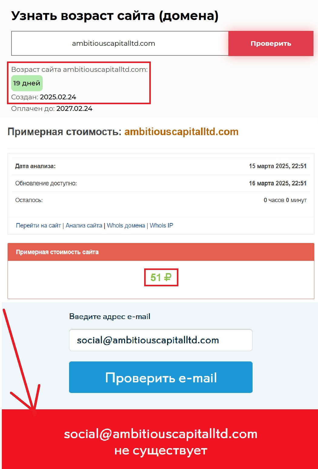 Дальше — еще интереснее. Сайт существует всего 19 дней. Для серьезной финансовой организации это ничтожно малый срок. А если учесть, что такие «брокеры» обычно работают по схеме «собрать деньги и исчезнуть», становится очевидно: перед нами контора-однодневка, которая закроется, как только наберет достаточное количество средств с доверчивых клиентов. Причем стоимость самого сайта настолько мизерная — ровно 51 рубль, что говорить о каком-то профессиональном подходе просто смешно.