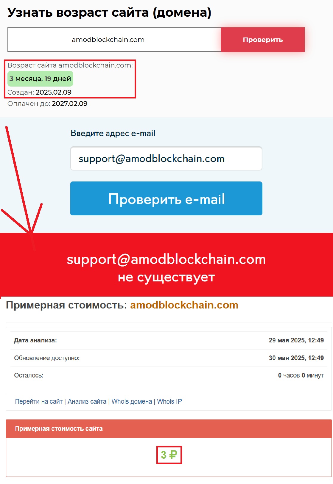 Цена сайта, кстати, по информации с анализа — три рубля. Это все, что вам нужно знать о серьезности проекта. Хотя нет, не все. Там еще указана почта support@amodblockchain.com и адрес 5835 Waterford District Dr # 100, Miami, FL 33126, United States. Но попробуйте прийти и спросить что-нибудь. Или напишите. Ответа не будет. Или, в лучшем случае, вам ответит некий “представитель”, который попросит перевести деньги, чтобы “подтвердить личность”, “активировать счет” или еще какую-нибудь чушь. Да-да, именно так это и работает.