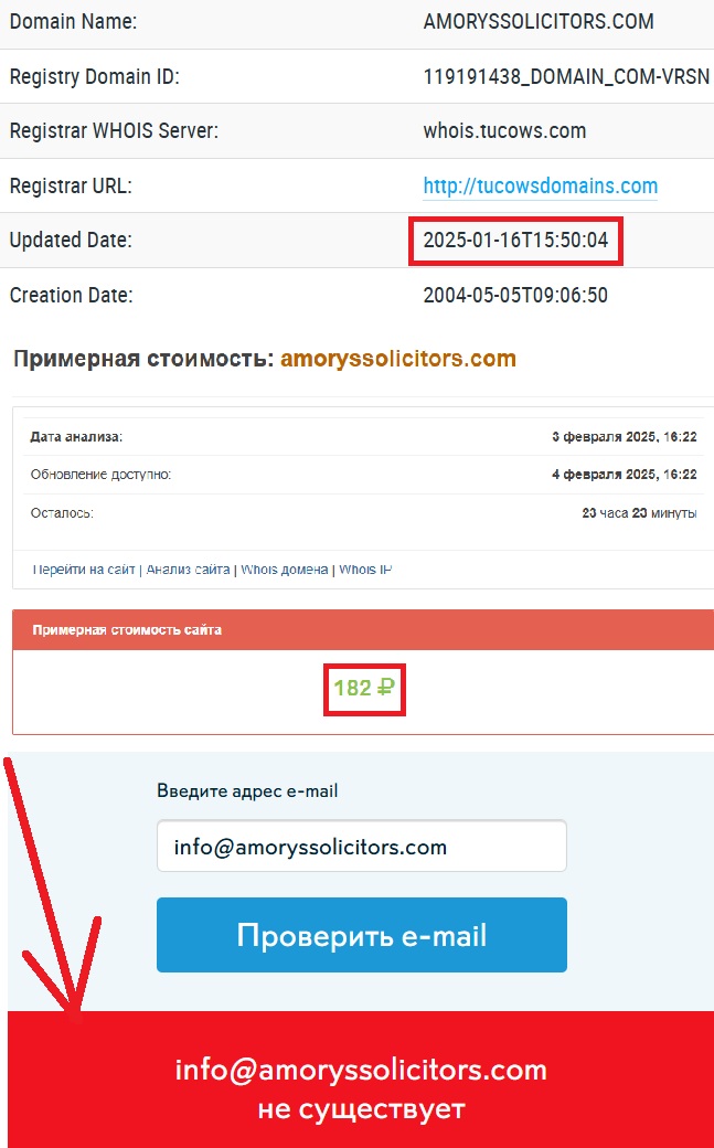 Если бы перед нами была серьезная юридическая компания, то ее официальная страница выглядела бы куда более убедительно. Однако реальность совсем иная: сервис для проверки возраста домена показывает, что стаж проекта — всего 18 дней, а стоимость сайта — смешные 182 рубля. Это явно не признаки серьезной компании, которая годами нарабатывает репутацию и заботится о своих клиентах.