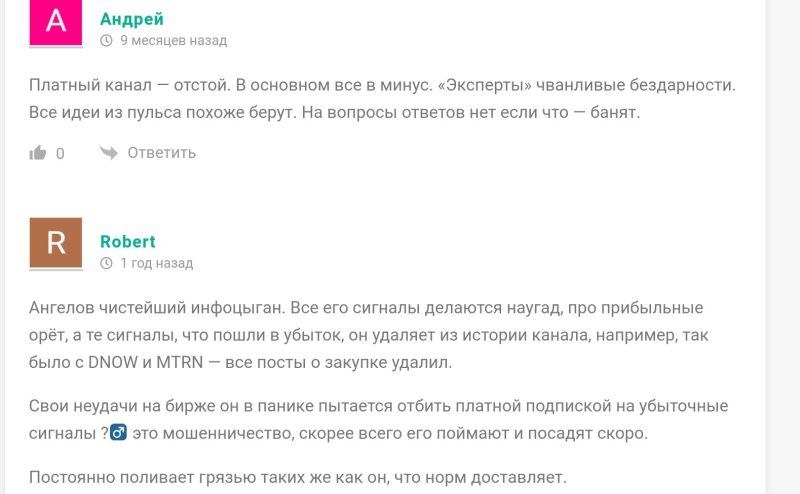 Несмотря на все это, репутация у вышеназванного проекта далека от идеала. Некоторые люди сообщают, что админ продает подписки на закрытый канал, где предоставляет некачественные сигналы. Другие пишут о прогнозах на малоизвестные и неактивные криптовалюты, покупка которых ничего не приносит (активы невозможно продать). Третьи отмечают то, что для получения бесплатных прогнозов требуется регистрация на рекламируемой бирже по реферальной ссылке автора. При этом юзеры подчеркивают низкое качество опубликованных сведений для работы.