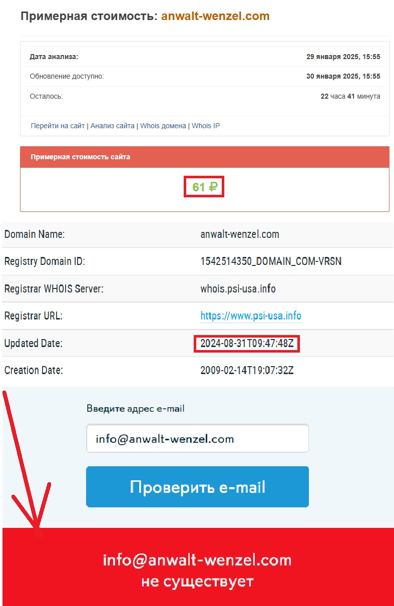 Стоимость сайта ничтожно мала — 61 рубль, что явно не соответствует уровню серьезной юридической компании. Возраст этого лохотрона составляет больше 15 лет, но не стоит вводить себя в заблуждение и верить в подобные заявления. Проверка домена показала, что аферисты просто купили старый домен, созданный 14 февраля 2009 года, и поменяли его под себя 31 августа 2024.
