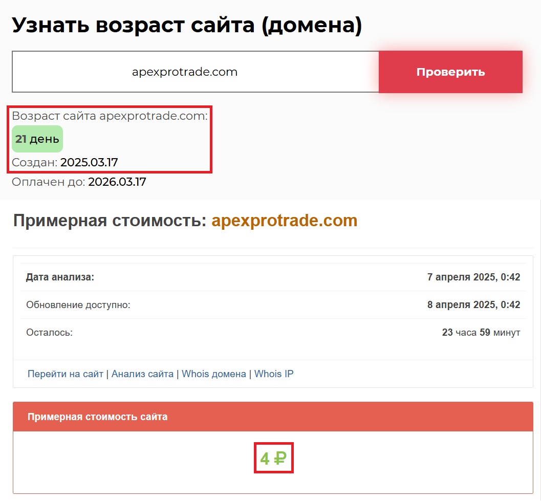 Ах, да, домен. Его возраст — просто смех. Всего 21 день, то есть, платформа появилась 17 марта 2025 года. Какой там «многолетний опыт», о чем вы вообще? Нормальные компании годами зарабатывают себе репутацию, создают дорогие сайты с уникальными функциями. И самое печальное — с вами никто не будет говорить. Контактов нет. Ни телефона, ни реального адреса, ни соцсетей. Да и стоимость сайта, между прочим, составляет какие-то жалкие четыре рубля. Это даже звучит смешно. Кто будет вкладывать деньги в проект, где сама платформа не стоит ни копейки?