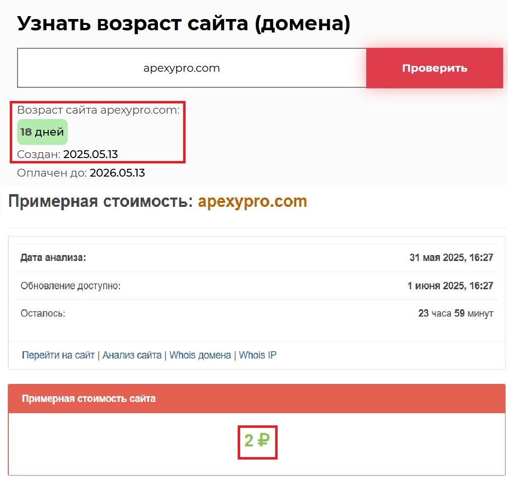 Кстати, домен был зарегистрирован всего 18 дней назад — 13 мая 2025 года. Меньше месяца. И это у компании, которая позиционирует себя как «опытный международный посредник». Разве может такой срок говорить о надежности? Сами подумайте. Мы же в свою очередь еще проверили стоимость самого домена. Два рубля. Даже говорить ничего не хочется. Вот и весь масштаб бизнеса.