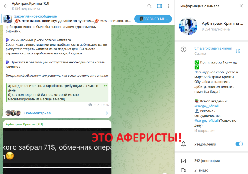 Аферисты в Телеграм пачками создают каналы, в которых продвигают связки по арбитражу крипты и фальшивые обменные пункты. Одним из таких является паблик Арбитраж Крипты. Подписчикам предлагают солидный заработок, показывают несуществующие результаты, выманивают средства, а затем кидают.