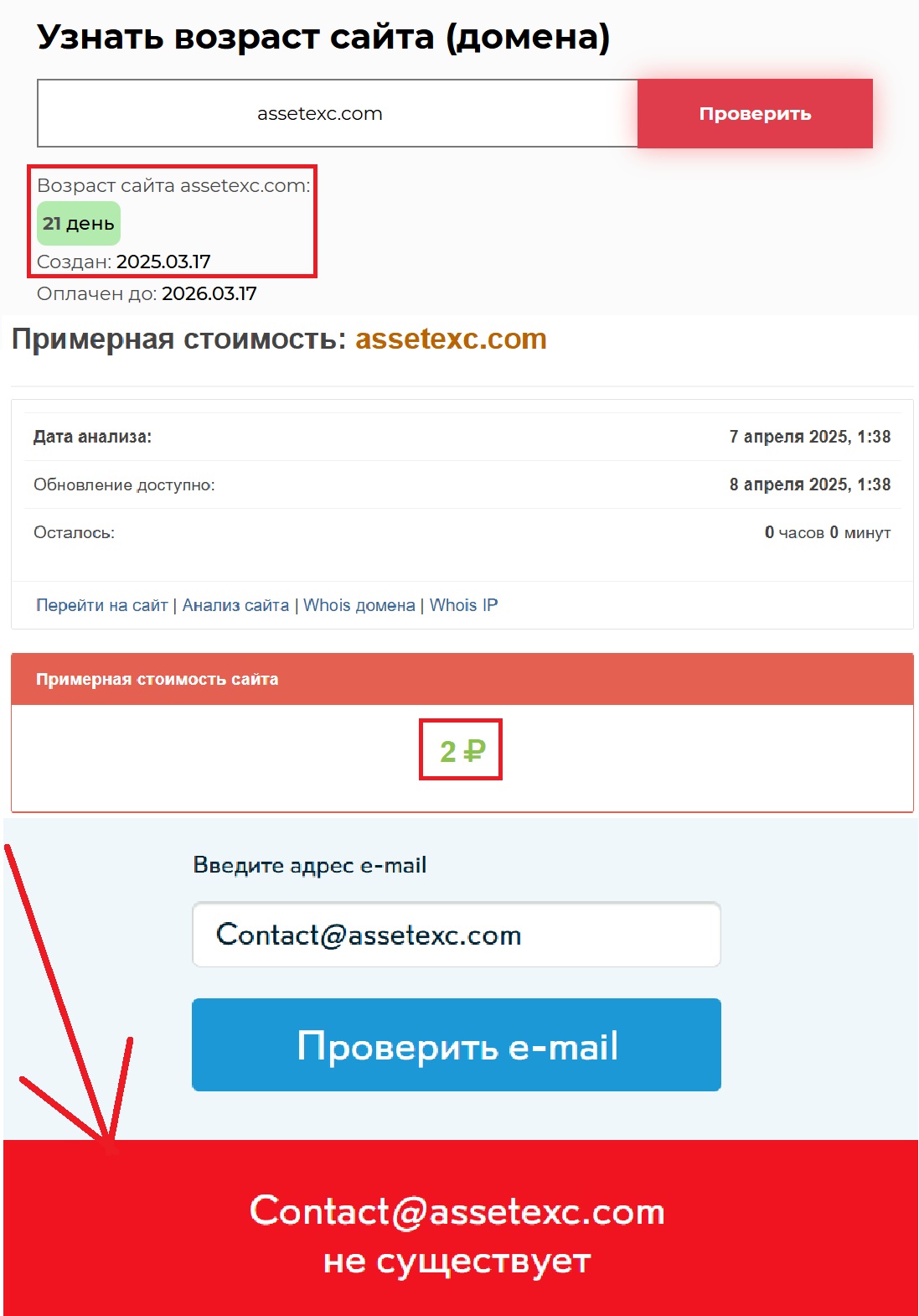 Проверка через Whois и Seolik вовсе разрушает сказку окончательно. Домен, оказывается, стоит всего лишь два рубля, что ничтожно мало для легальной компании. Сказки о многолетнем опыте? Но ведь, если копнуть чуть глубже, то видно: первые упоминания — только с марта 2025 года, а если быть точнее — с 17 марта. Какой там «многолетний опыт», о чем вы? Из контактных данных есть только почта Contact@assetexc.com, но и она полностью фейковая.