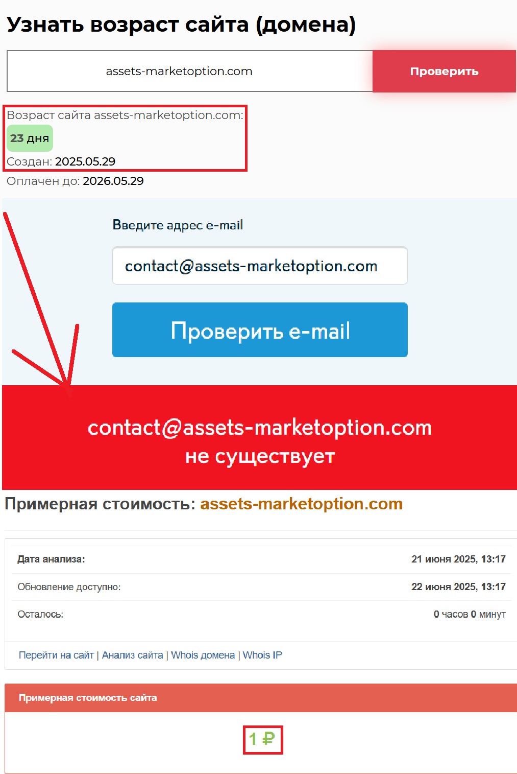 Цена сайта — отдельная история. Один рубль. Да-да, буквально. Даже звучит как шутка, но это правда. Вы бы отдали свои накопления сервису, который стоит дешевле чашки кофе? Вот и мы бы не стали. Оставить контакт — пожалуйста. Указана почта contact@assets-marketoption.com, номер телефона +1(302) 883-8085. Но с кем вы там общаетесь? Попробуйте написать — в лучшем случае получите шаблонный ответ.