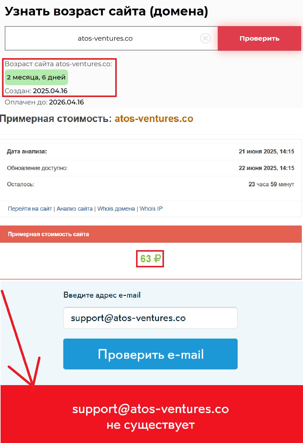 Что касается лицензий и регистраций — тут, увы, все предсказуемо. Их просто нет. Ни от Центробанка РФ, ни от европейских регуляторов, ни от оффшорных структур. И это ключевой момент. Связаться с ними? Удачи. Никаких номеров, фейковый почтовый ящик support@atos-ventures.co. Только форма обратной связи, которая, по всей видимости, нужна не для помощи, а для сбора вашей информации. Имя, телефон, почта… Все это может быть использовано против вас.