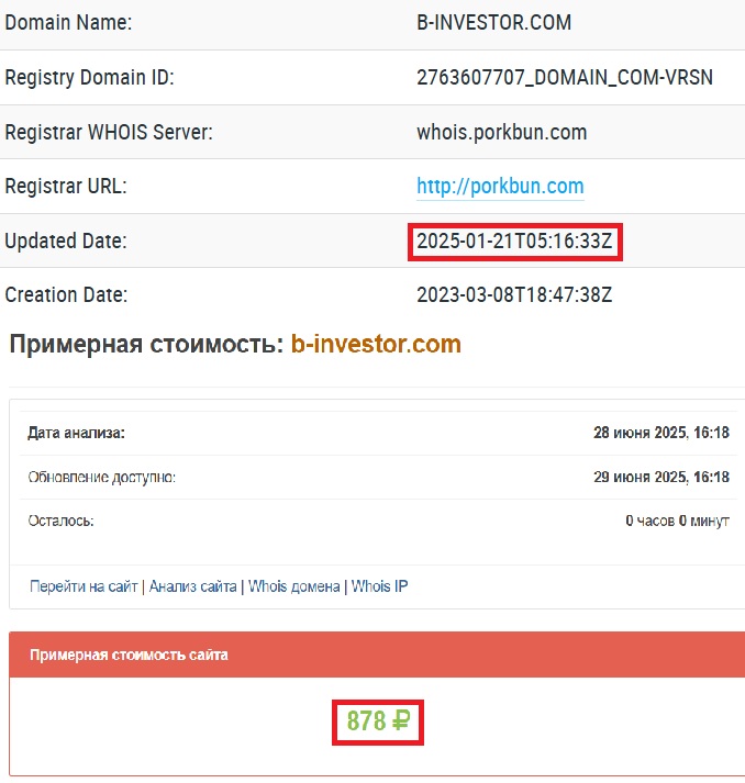 Мы решили копнуть глубже и проверили сайт через сторонние сервисы. Оказалось, что B-Investor использует старый домен, работающий с марта 2023 года, вот только аферисты выкупили его 21 января 2025 года. Серьезно? За такой срок невозможно построить полноценную, тем более международную брокерскую компанию. И вот еще деталь, которая нас просто убила наповал: стоимость сайта — 878 рублей. Жаль только что большая часть этой цены обусловлена старым проектом, работающим на этом домене. Отзывы, которые нам довелось увидеть, сплошь негативные. Хотя, если честно, ожидать чего-то другого было бы наивно. Нельзя верить в серьезные заработки там, где проект может закрыться в любой момент, прихватив ваши сбережения.