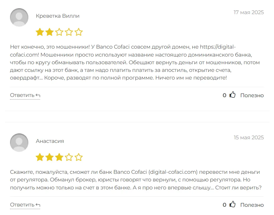 О мошенничестве в Banco Cofaci свидетельствуют отзывы, оставленные пользователями на независимых площадках в Интернете. Люди жалуются на блокировку аккаунтов, отсутствие помощи, поддержки, потерю собственных денег и даже на требования совершения дополнительных платежей (якобы для оплаты верификации и прочего).