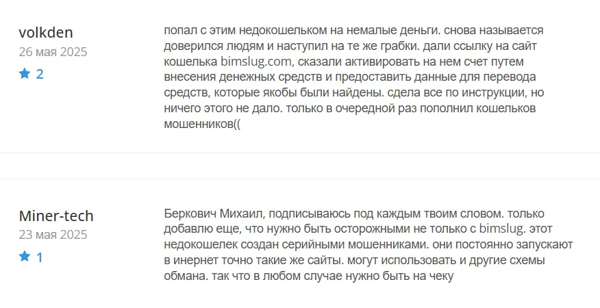 При изучении откликов о Bimslug на независимых площадках, нам удалось найти немало негативных комментариев. Люди жалуются на отсутствие живой обратной связи, проблемы с выводом средств, игнорирование обращений в службу поддержки, а также на потерю собственных денег.