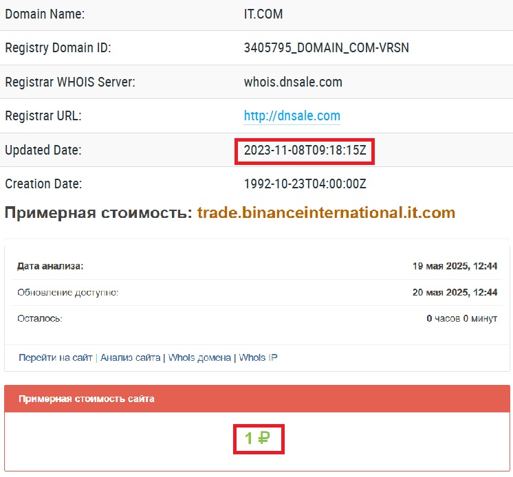 Они красиво пишут о «международной платформе», «опыте с 2020 года» и «команде экспертов». Но стоит копнуть хоть немного глубже — и правда выходит наружу. По данным сервисов анализа доменов видно, что Binance International выкупил старый домен в ноябре 2023 года, а с тех пор скрыл любую информацию о нем. А все, что было до этого — просто пустышка. Сайт принадлежал другому проекту. Ни клиентов, ни активности, ни упоминаний.